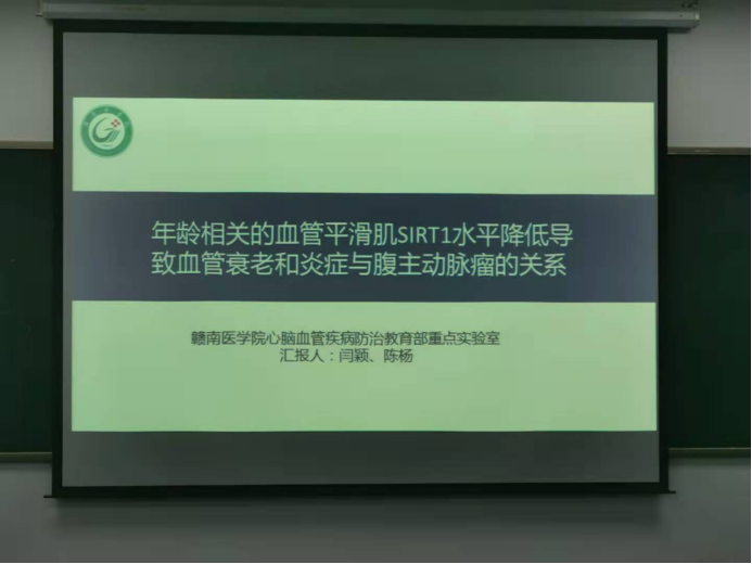 陈杨同学作了题为《Age-Associated Sirtuin1 Reduction in Vascular Smooth Muscle Links Vascular Senescence and Inflammation to Abdominal Aortic Aneurysm》的文献汇报。该文研究发现老龄小鼠动脉血管平滑肌细胞中组蛋白去乙酰化酶SIRT1显著降低,其降低导致血管衰老和炎症,进而促进了腹主动脉瘤的发生和破裂;而增加SIRT1的表达能够有效减少腹主动脉瘤的发生和破裂;该研究为腹主动脉瘤的防治提供了新的靶点。