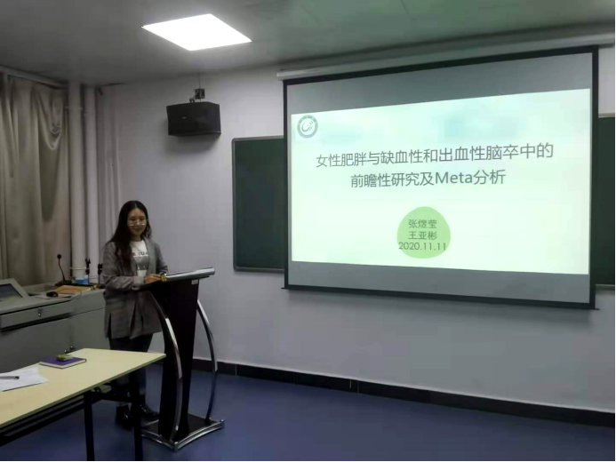 张煜莹同学作了题为《Adiposity and ischemic and hemorrhagic stroke:Prospective study in women and meta-analysis》的文献汇报,系统介绍了meta分析的原理及应用,让同学们受益匪浅。