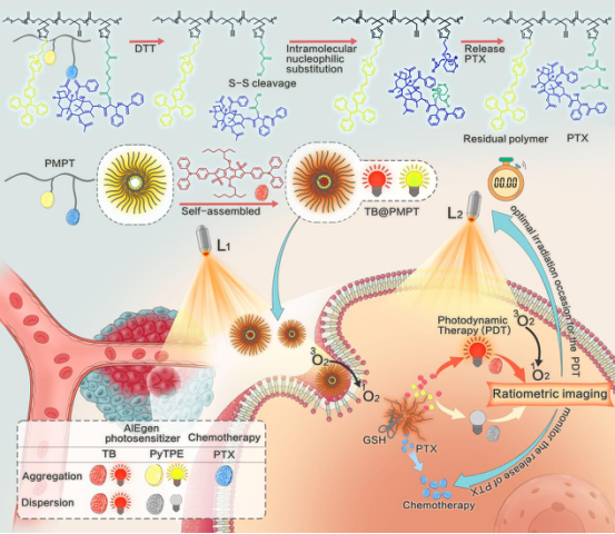 基于以上科学问题,易小庆副教授团队通过设计具有还原响应性的高分子前药胶束,通过负载两种AIE光敏剂构建比率荧光探针,实现化疗药物释放的实时监测和精准地指引光动力治疗,并利用光化学内化效应提高抗肿瘤治疗效果。该研究成果以实验室学术骨干易小庆副教授和中国地质大学(武汉)胡晶晶副教授为论文的共同第一作者,中国地质大学(武汉)娄筱叮教授、夏帆教授和香港科技大学唐本忠院士为共同通讯作者发表在ACS Nano的杂志上(IF=14.588),该研究具有重要的应用价值,有望为增强联合治疗效果提供更有价值的思路。