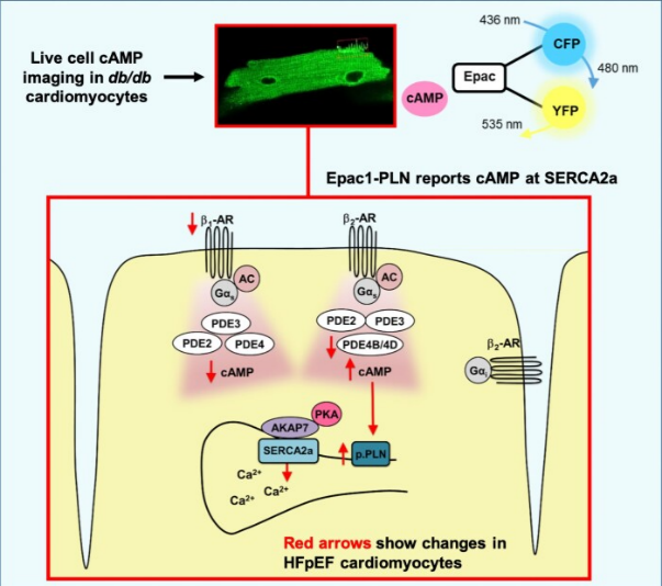 赖平博士及其导师Viacheslav O Nikolaev教授团队选择leprdb变异小鼠(db/db)作为肥胖和2型糖尿病诱导HFpEF模型,并创新性地构建了稳定表达Epac1-PLN荧光能量共振转移生物探针的db/db小鼠。研究结果发现,①与健康对照(db/+)组相比,db/db心肌细胞观察到SERCA2a微域内β1肾上腺素能受体的脱敏,钙离子重摄取的延迟;②db/db心肌细胞的SERCA2a微域内,β2肾上腺素能受体刺激产生大量cAMP,并伴随着PLN磷酸化增加和钙再摄取加速,提示db/db心肌细胞中β2肾上腺素能受体控制的增加是维持SERCA2a介导的钙循环和心脏舒张的内在补偿机制。这些新发现为HFpEF心肌细胞SERCA2a微域内重塑机制提供了新视角,并为肥胖和2型糖尿病相关HFpEF新疗法提供了坚实的理论基础。
